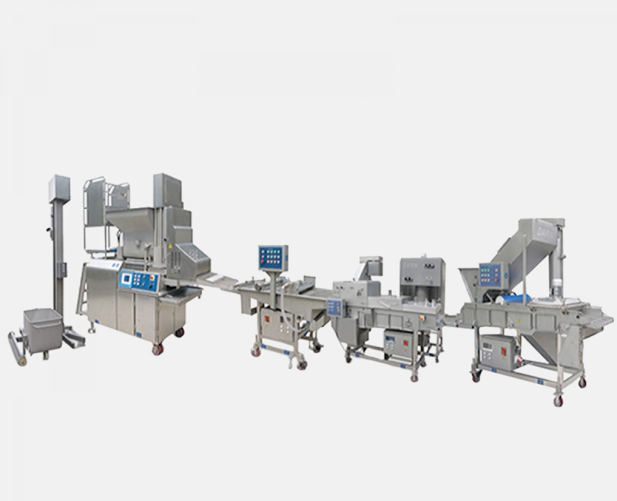 Hamburger Forming Line can make hamburger patty, chicken nuggets, chicken or beef steak, pumpkin patty, etc. used by KFC, McDonald, Marry Brown etc. This forming line comprises of machines for forming, battering, flouring (pre-dusting), breading, and frying.